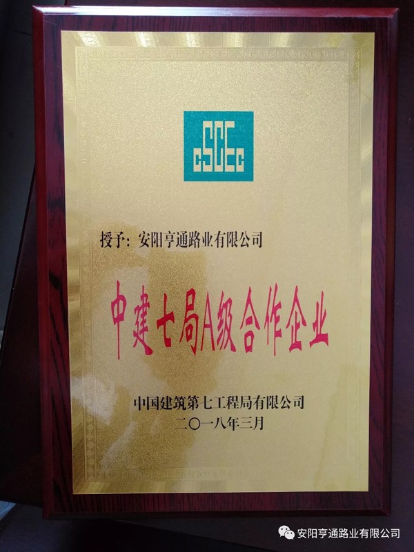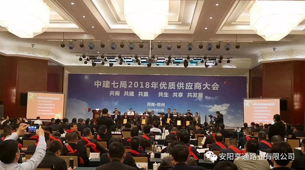 在2018年3月8日中建七局交通公司“2018年度生產(chǎn)推進(jìn)會暨2017年度供應(yīng)商大會”上,安陽亨通路業(yè)有限公司又獲得了中建七局交通公司頒發(fā)的“優(yōu) 秀合作企業(yè)”的榮譽(yù)稱號。